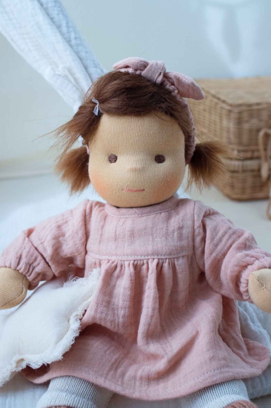 Celena hat braune aufgestickte Augen und braune Haare aus Mohairfell, die du kämmen und zu Zöpfchen frisieren kannst. Soll Celena eine andere Haar oder Augenfarbe bekommen, kannst du deine Wünsche unter Variationen angeben.
