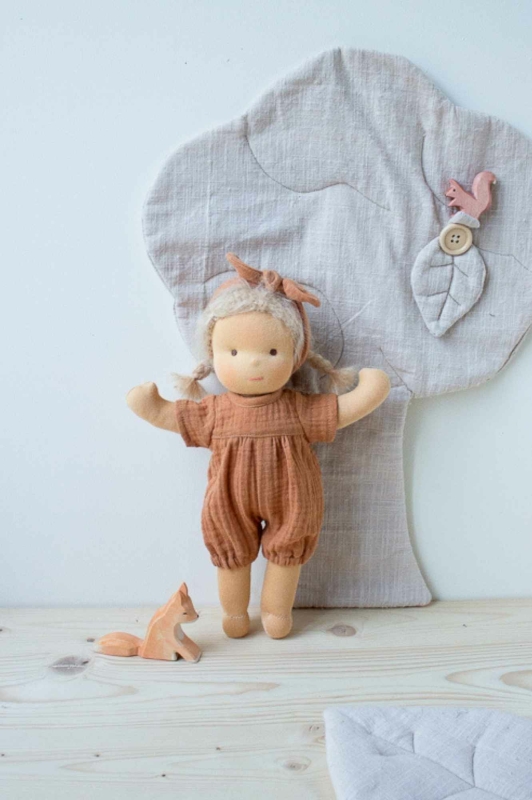 Ella trägt einen Overall mit kurzen Ärmeln und ein Haarband aus zimtfarbenem Musselin. Soll Ella statt des Overalls lieber ein Kleid (aus dem gleichen Stoff) tragen, kannst du das bei den Variationen angeben.
